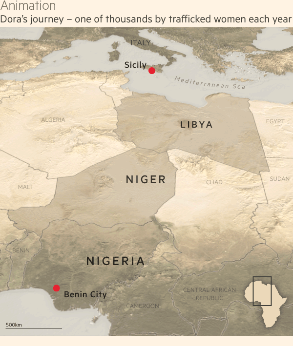 Example: Animation of Dora's journey from Nigeria to Sicily - one of thousands by trafficked women each year.